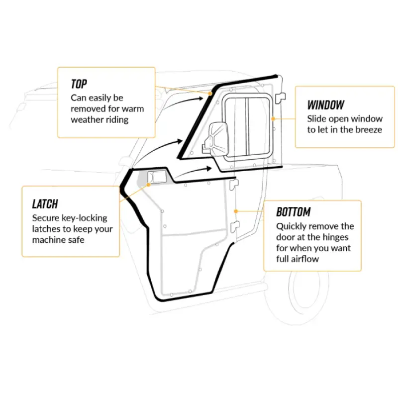 Adjust your airflow with ease—the convertible design allows these doors to transform into sturdy elbow-height half doors, perfect for keeping out mud and debris while letting in refreshing summer air. Remove the top half for comfortable armrest access, or detach the bottom half entirely for a fully open cab experience during warmer months.